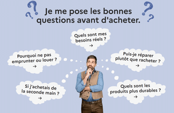 Aller vers une consommation responsable, c’est notamment acheter moins mais mieux : privilégier des produits locaux, durables et réparables, ou des services neutres en carbone (artisans à vélo…) ; réduire l’impact environnemental de ses achats (grouper ses achats, acheter sans emballage…)